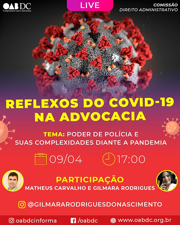 A presidente da Comissão de Direito Administrativo da OAB de Duque de Caxias e o professor Matheus Carvalho, especialistas em Direito Administrativo, irão debater o tema “Poder de polícia e suas complexidades diante da pandemia".