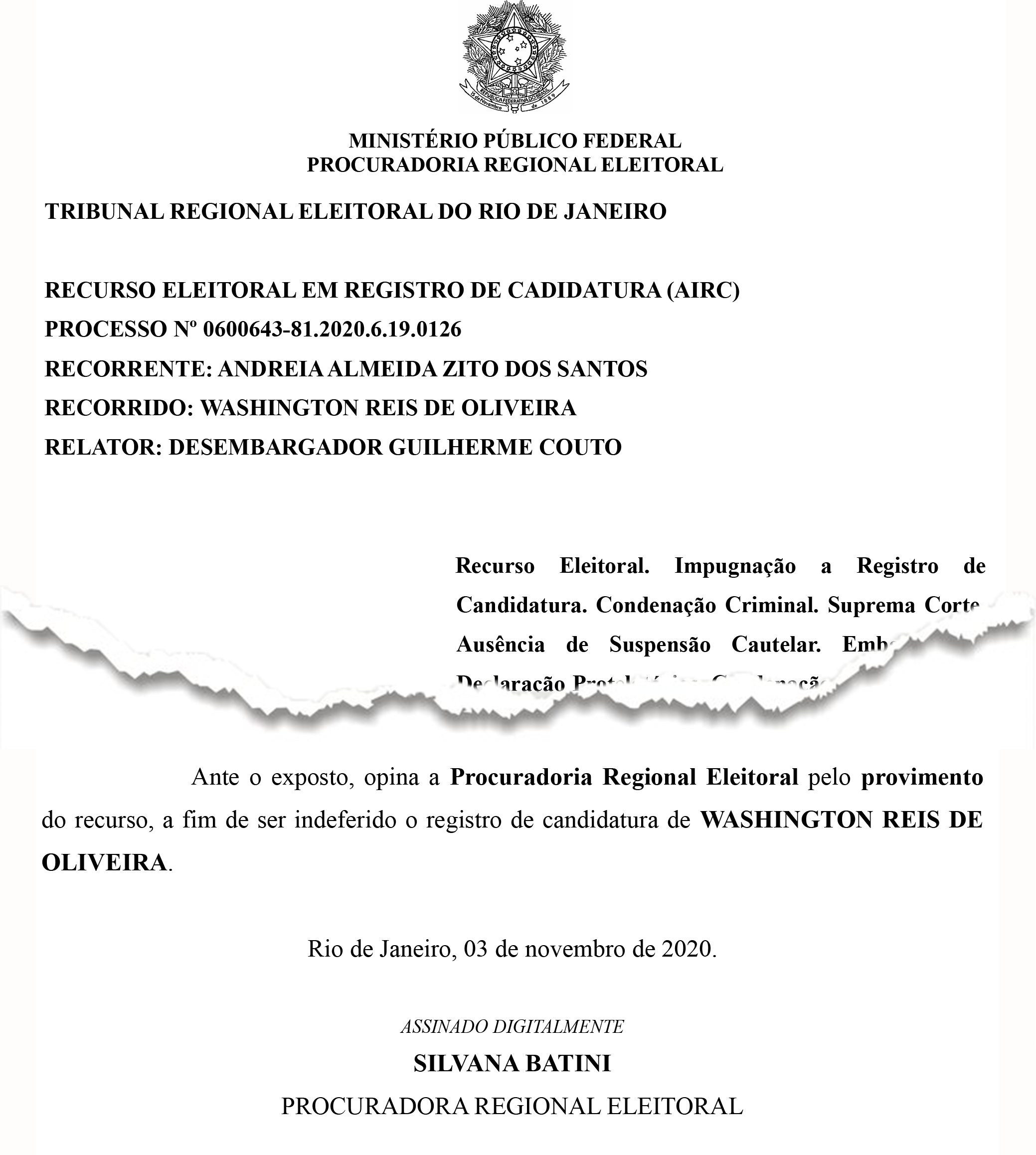 O Ministério Público Federal, através da Procuradoria Regional Eleitoral, opinou ontem (03/11) pelo deferimento do recurso contra a sentença proferida pelo Juízo da 126ª Zona Eleitoral de Duque de Caxias, que deferiu o registro de candidatura do atual Prefeito Washington Reis (MDB).