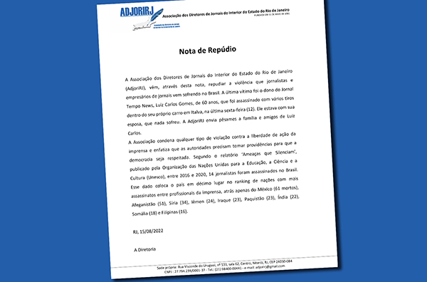 A Associação dos Diretores de Jornais do Interior do Estado do Rio de Janeiro (AdjoriRJ) divulgou nota repudiando “a violência que jornalistas e empresários de jornais vem sofrendo no Brasil".