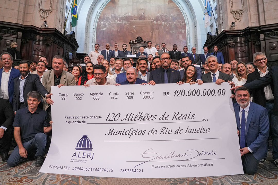A Assembleia Legislativa do Estado do Rio de Janeiro (Alerj) entregou nesta sexta-feira (19/12), durante solenidade no Palácio Tiradentes, cheque simbólico aos municípios fluminenses e ao Executivo, referentes ao repasse de R$ 220 milhões, economizados pela Casa ao longo de 2025. Desse total, R$ 120 milhões foram distribuídos às 92 cidades, enquanto os outros R$ 100 milhões destinados ao Estado. O presidente em exercício, deputado Guilherme Delaroli (PL), anunciou que o pagamento seria efetuado no mesmo dia.