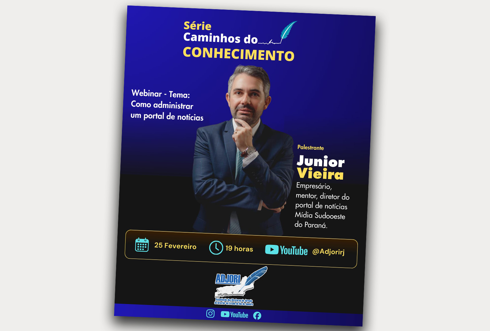 A Associação dos Diretores de Jornais do Interior do Estado do Rio de Janeiro- ADJORIRJ lança, a partir do dia 25 de fevereiro de 2026, a série de webinars intitulada “Caminhos do Conhecimento”. A iniciativa tem como objetivo promover a troca de experiências, a capacitação e o debate sobre comunicação, empreendedorismo e inovação no jornalismo do interior.