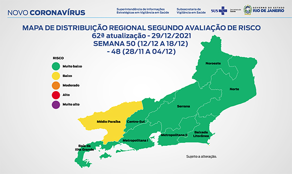 As regiões Centro Sul, Metropolitana I, Metropolitana II, Serrana, Norte, Baixada Litorânea, Baía de Ilha Grande e Noroeste estão classificadas como risco muito baixo, em bandeira verde. A região do Médio Paraíba ficou classificada como bandeira amarela, com risco baixo. A alteração nessa região ocorreu devido ao aumento de 3 óbitos (de 3 para 6) nas semanas analisadas.