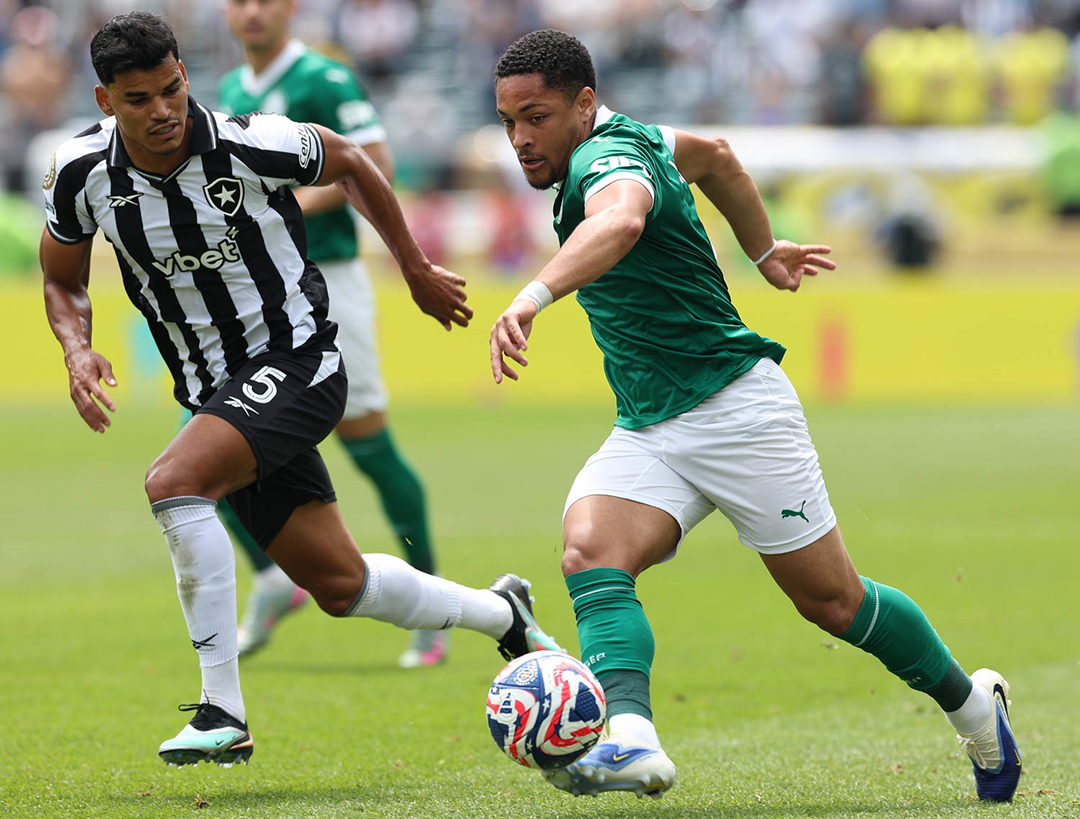 O técnico do Botafogo, Renato Paiva, optou por uma escalação com três volantes, enquanto Abel Ferreira, do Palmeiras, colocou três jovens no ataque: Estêvão, Allan e Vitor Roque. Com isso, o Verdão assumiu a posse de bola e o controle do jogo. Se não criou tantas chances concretas, esteve sempre rondando o gol defendido por John. Na melhor oportunidade, já nos acréscimos, Richard Rios finalizou de fora da área, a bola desviou na zaga e passou perto, por cima do gol. O Botafogo pouco ameaçou.