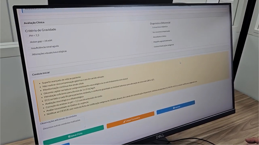 A ferramenta foi desenvolvida pelo Centro de Informações Estratégicas em Vigilância em Saúde (CIEVS) do Rio de Janeiro. A sugestão para usá-la nos casos suspeitos de intoxicação por metanol veio dos técnicos que participaram da Sala de Situação que coordena as ações. A plataforma calcula indicadores de gravidade automaticamente e orienta sobre o uso de antídotos e indicação de outros tratamentos, como hemodiálise, por exemplo. Além disso, orienta a conduta inicial dos profissionais, e as monitorizações necessárias para esses pacientes.
